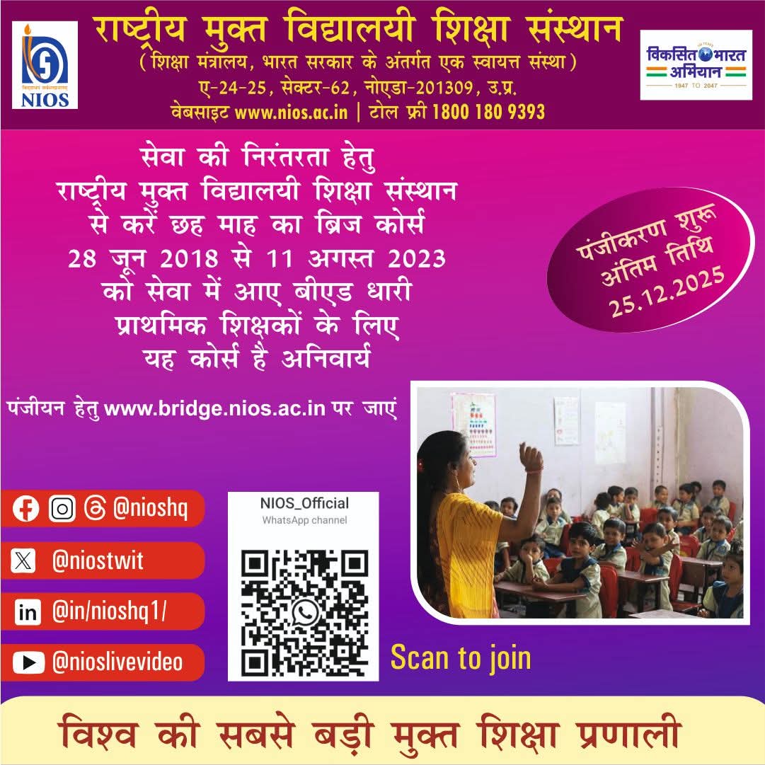 Indicative vacancy notification for the post of State Consultant - (20) for Six Months Certificate Course (Bridge) in Primary Education at NIOS's Regional Centres purely on contractual basis for a period of six months.