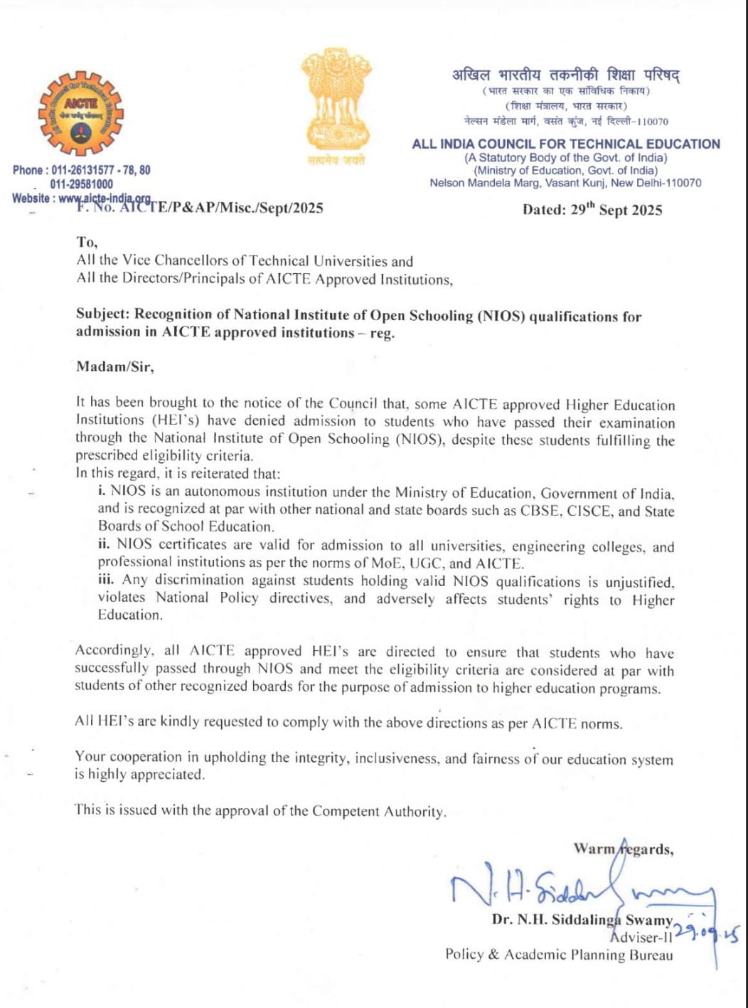 एआईसीटीई द्वारा अनुमोदित संस्थानों में प्रवेश के लिए राष्ट्रीय मुक्त विद्यालयी शिक्षा संस्थान (एनआईओएस) की योग्यता को मान्यता देने के संबंध में